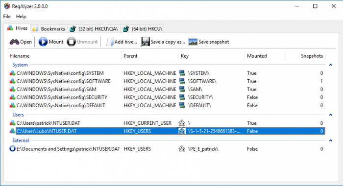RegAlyzer is a tool to browse and change the registry. It was created because of a few features we missed in the original regedit tool, from support for exotic value types over background and regular expression search to better bookmarks, displaying .reg files in the accustomed style and a history view. RegAlyzer 2, currently available as a release candidate, will support a multi-tabbed interface, value interpretations, constant names for values, and snapshots of hives to track changes.